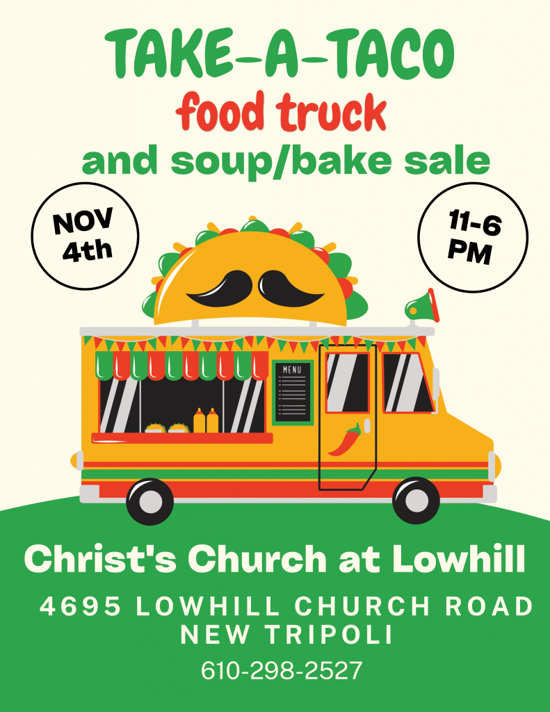 Food truck will be at Christ's Church at Lowhill from 11:00 a.m. to 6:00 p.m.